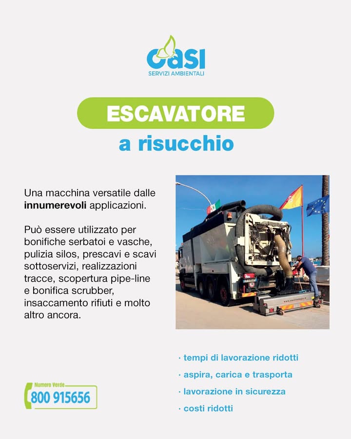 Leggi altro🚛 Escavatore a risucchio Oasi Servizi Ambientali Sicilia 🍃 Con l’escavatore a risucchio eseguiamo pulizie, svuotamenti e bonifiche ambientali in modo rapido, sicuro e a basso impatto ambientale ✔️ Questa tecnologia permette di operare ...